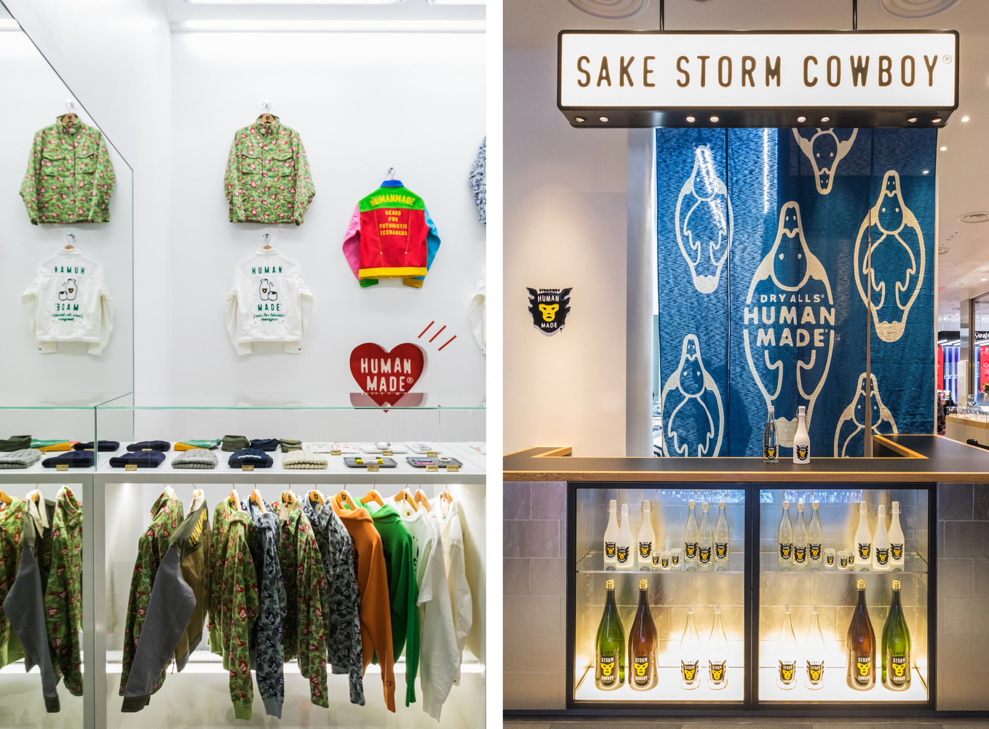 เหล้าสาเกยี่ห้อ " SAKE STORM COWBOY®︎" (คาวบอยปลาแซลมอนการส่งเสียงอึกทึกครึกโครม) ที่ NIGO® และวิลเลี่ยมส์ Farrell สร้างลูกตาของร้าน PARCO ชิบุยะของยี่ห้อ " HUMAN MADE®" ที่ NIGO® แสดงการชี้ทาง